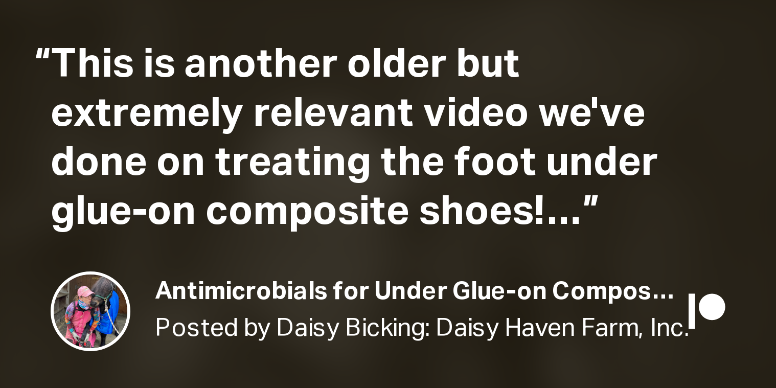 Antimicrobials for Under Glue-on Composite Shoes Posted on 26 November 2019 This is another older but extremely relevant video we've done on treating the foot under glue-on composite shoes... See the whole post on Patreon.