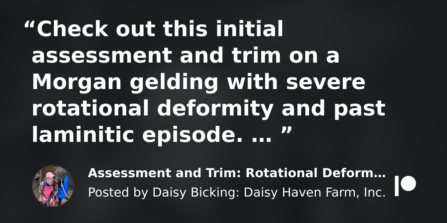 Assessment and Trim: Rotational Deformity with Chronic Laminitis Posted on 9 March 2023 Check out this initial assessment and trim on a Morgan gelding with severe rotational deformity and past laminitic episode... See the whole post on Patreon.