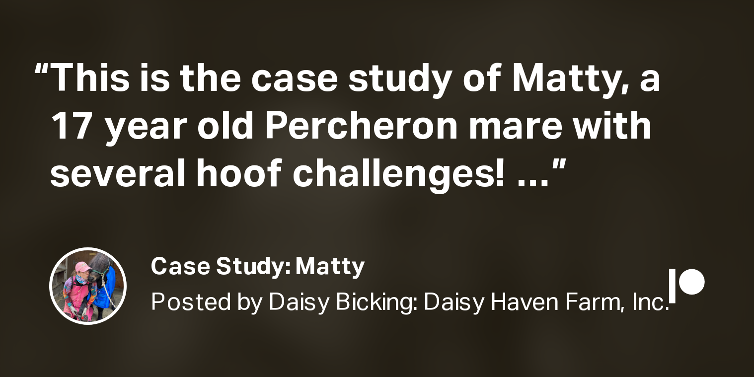 Case Study: Matty Posted on 26 March 2021 Newest case study is on Matty, 17 year old Percheron mare, with several significant hoof problems... See the whole post on Patreon.