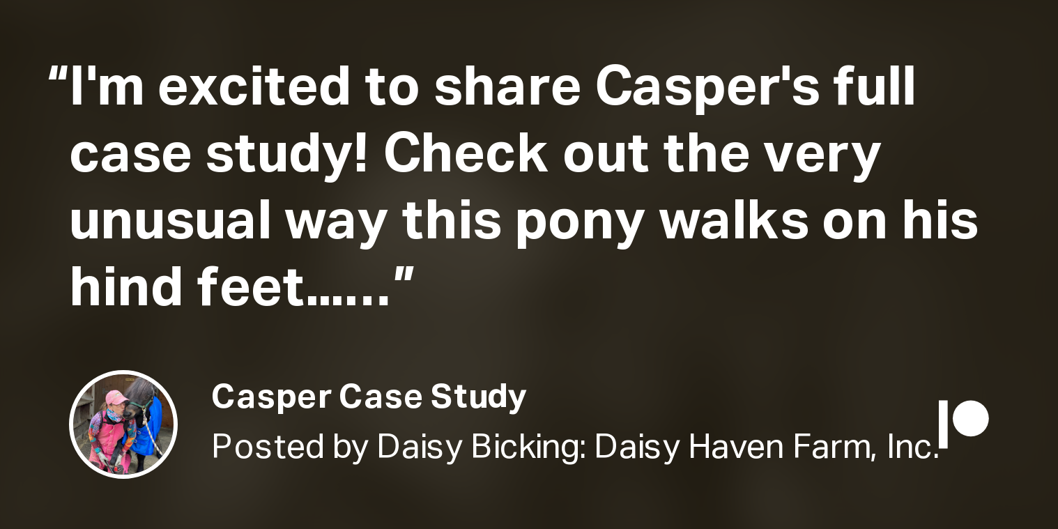 Casper Case Study Posted on 22 December 2019 I'm excited to share Casper's full case study! Check out the very unusual way this pony walks on his hind feet and what we did to resolve it... See the whole post on Patreon.
