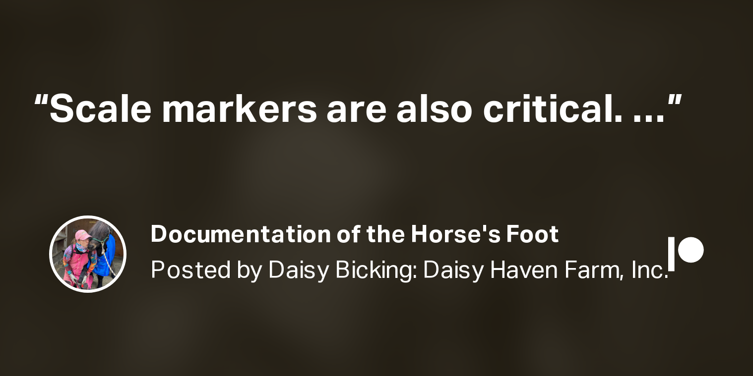 When taking photos of the horse's foot for data tracking purposes, images need to be:-Accurately acquired-Measureable with scale markers in the plane of interest-Repeatable in technique (easy to do or you won't stick with it!)-Consistent-Taken over time...