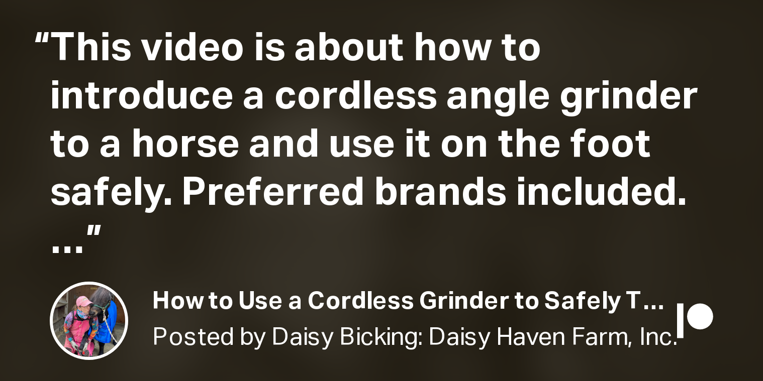 How to Use a Cordless Grinder to Safely Trim Posted on 6 April 2020 This video is about how to introduce a cordless angle grinder to a horse and use it on the foot safely... See the whole post on Patreon.