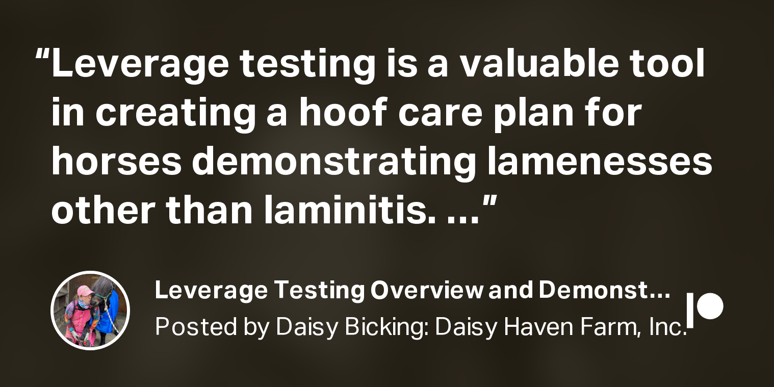 Leverage Testing Overview and Demonstration Posted on 12 June 2020 Leverage testing is a valuable tool in creating a hoof care plan for horses demonstrating lamenesses other than laminitis... See the whole post on Patreon.