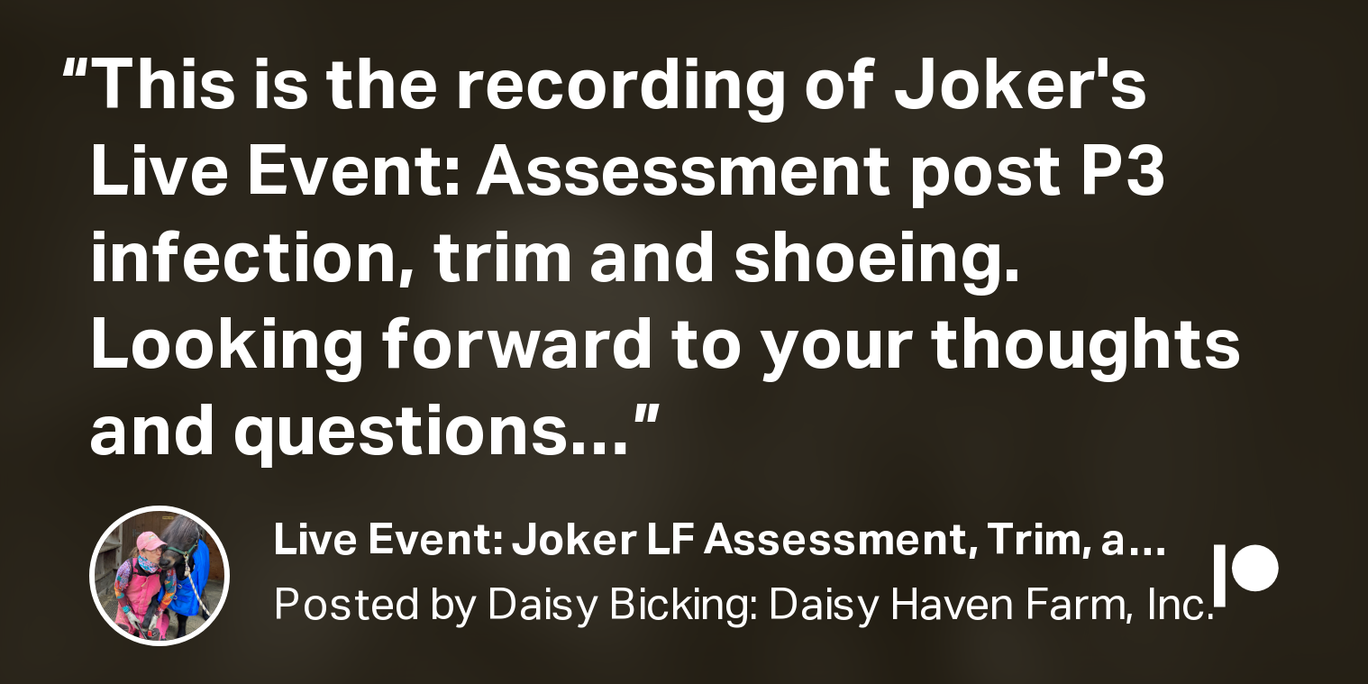 Live Event: Joker LF Assessment, Trim, and Shoeing Post Bone Infection Posted on 2 May 2022 This is the recording of Joker's Live Event: Assessment post P3 infection, trim and shoeing... See the whole post on Patreon.