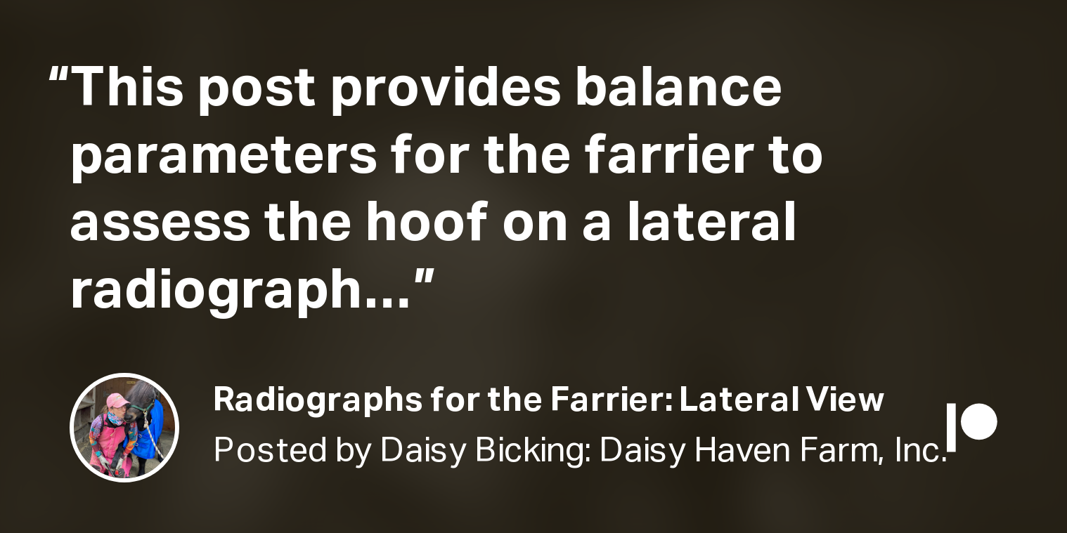 Radiographs for the Farrier: Lateral View Posted on 24 November 2019 Radiographs give the farrier a way to orient themselves in the foot and reliably relate the external structures to the internal anatomy... See the whole post on Patreon.