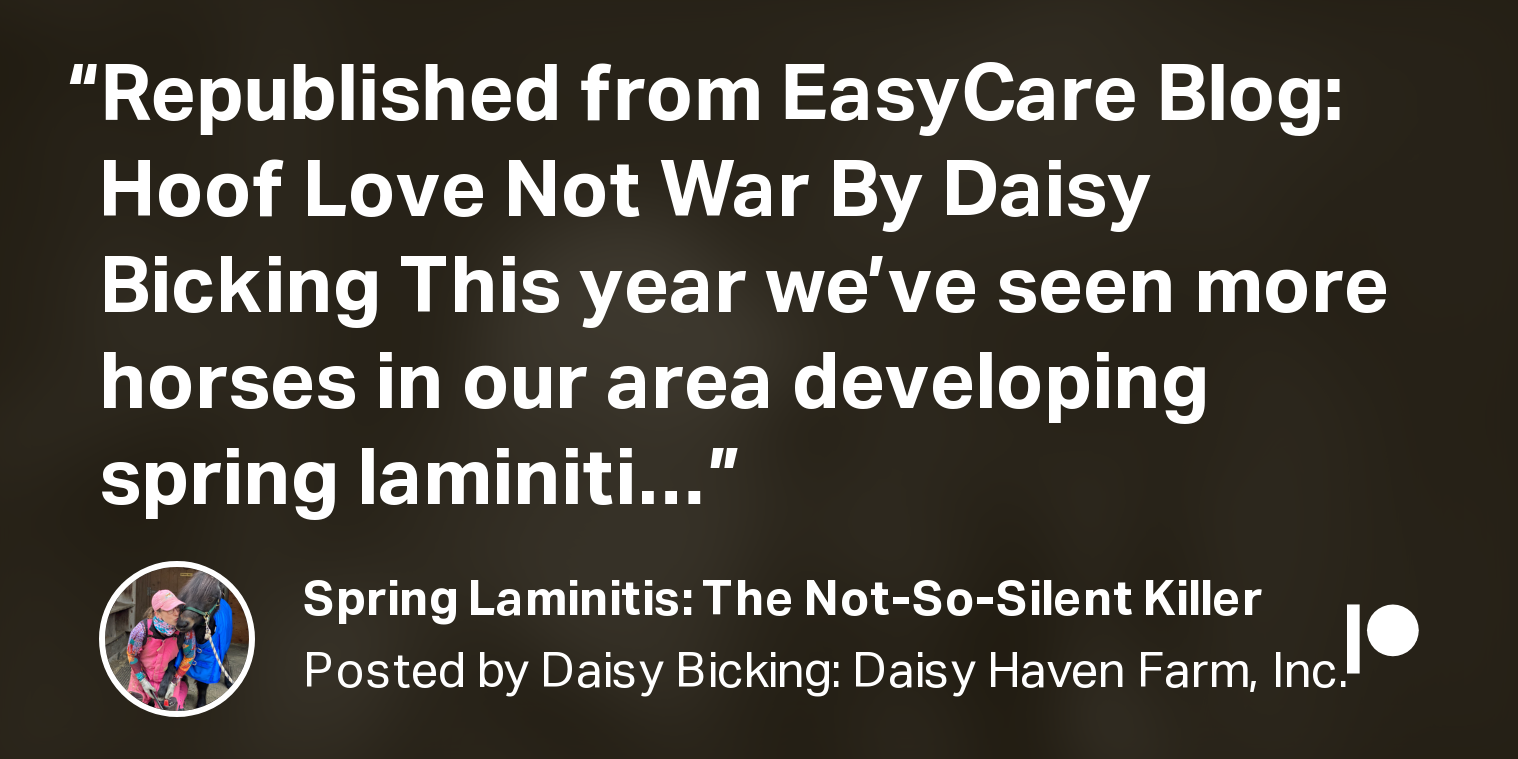 Spring Laminitis: The Not-So-Silent Killer Posted on 19 March 2022 Republished from EasyCare Blog: Hoof Love Not WarBy Daisy Bicking This year we’ve seen more horses in our area developing spring laminitis than ever before... See the whole post on Patreon.