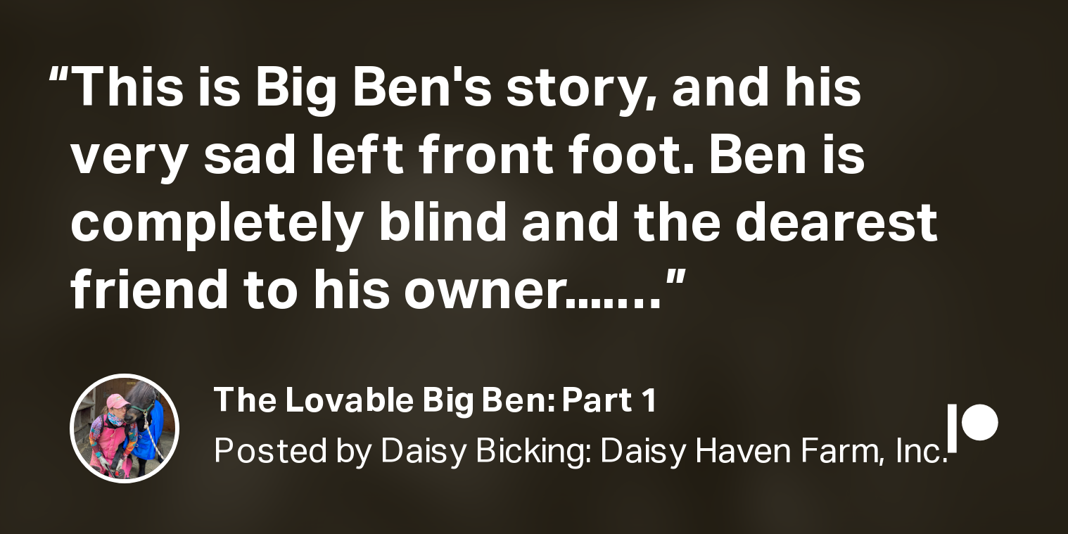 The Lovable Big Ben: Part 1 Posted on 27 December 2021 This is Big Ben's story, and his very sad left front foot... See the whole post on Patreon.