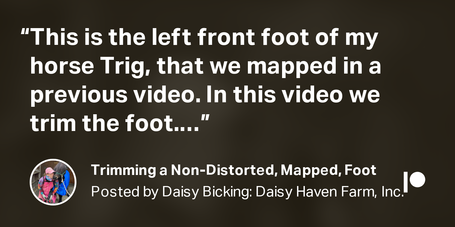 Trimming a Non-Distorted, Mapped, Foot Posted on 31 December 2019 This is the left front foot of my horse Trig, that we mapped in this video here: https://www.patreon.com/posts/32462033Now we're going to trim it... See the whole post on Patreon.